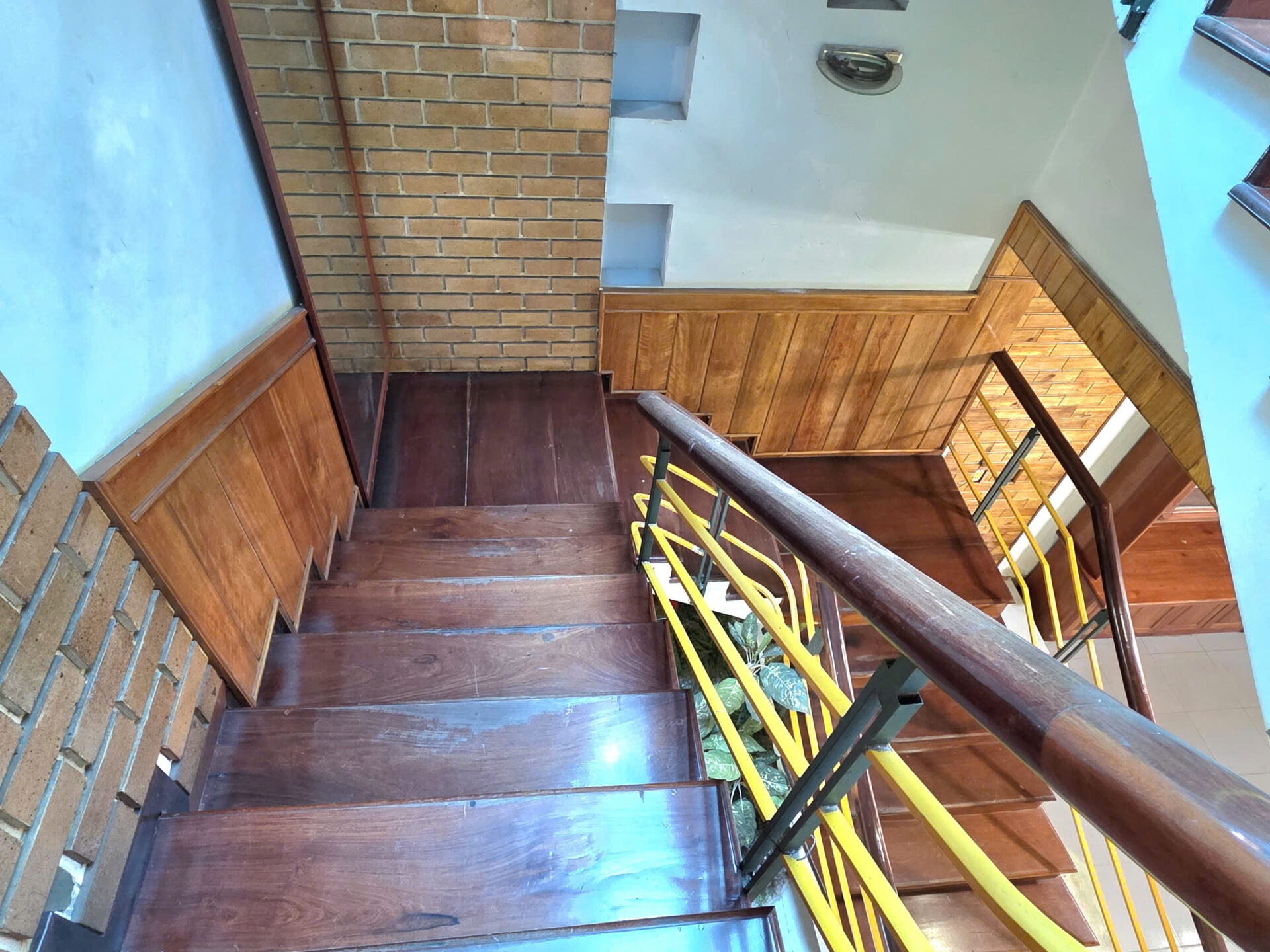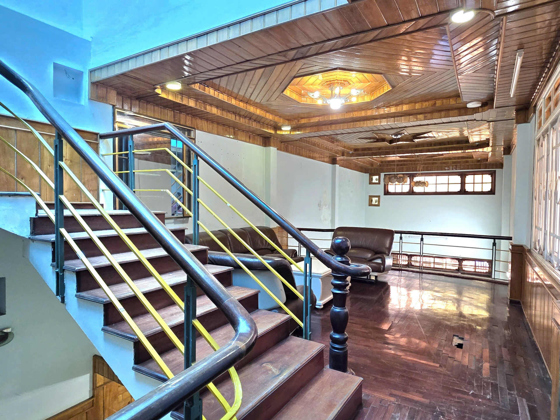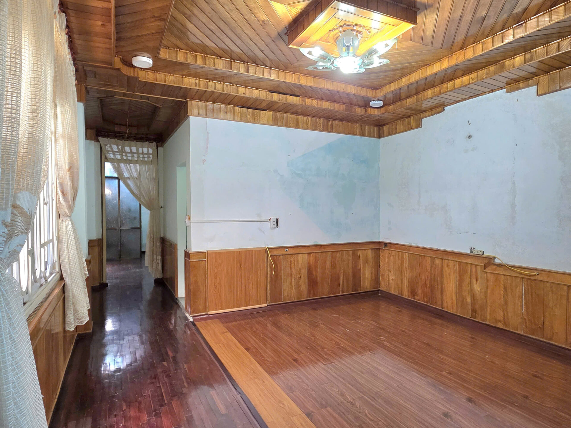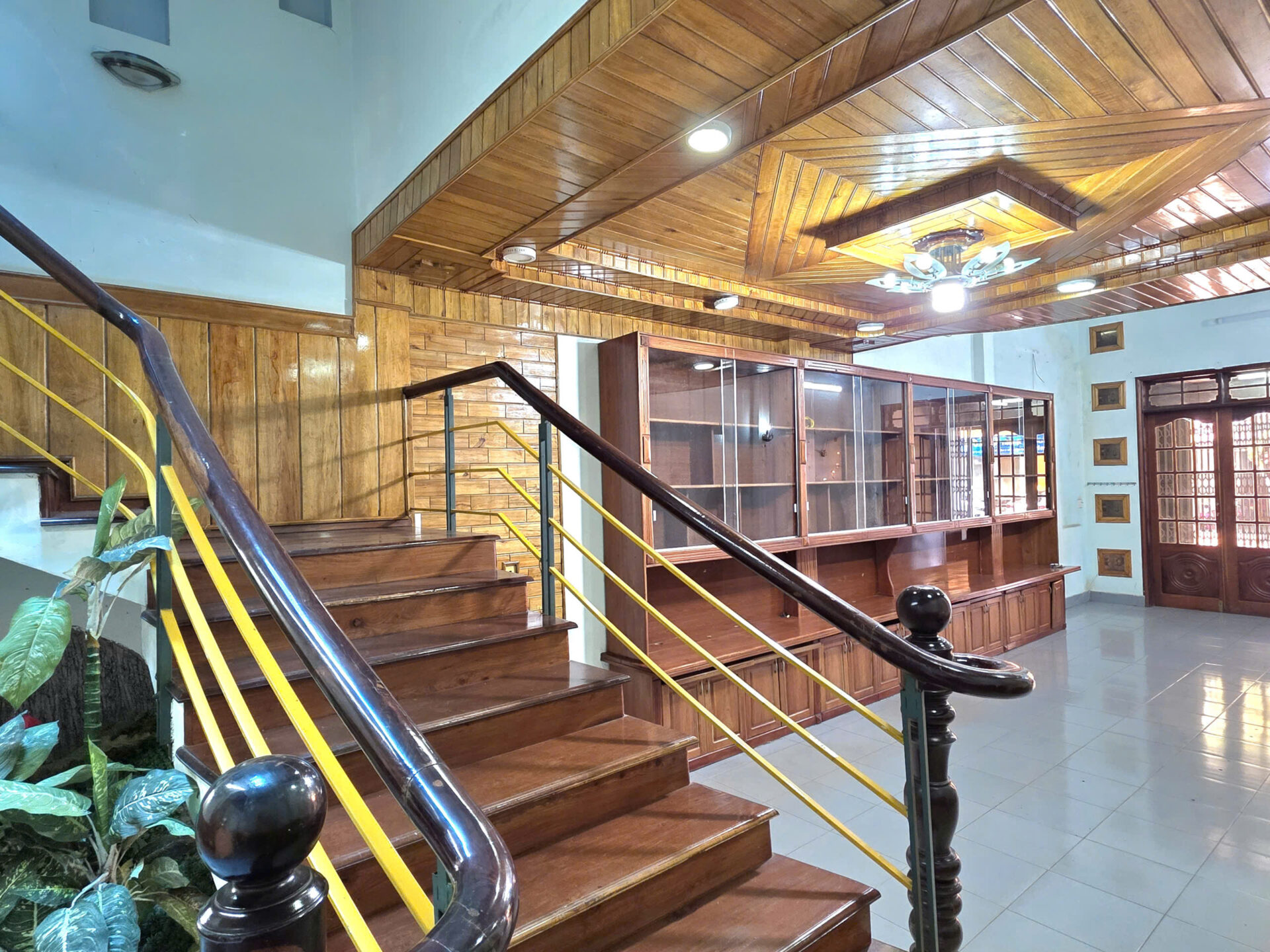 Trần và lamri tầng trệt + tầng lửng, cầu thang, tủ đều ốp gỗ tự nhiên nhóm 1.